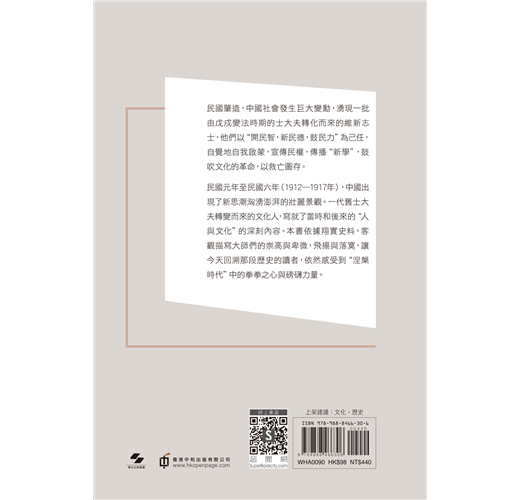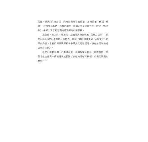 民國元年至民國六年(1912—1917年),中國出現了新思潮洶湧澎湃的壯麗景觀。一代舊士大夫轉變而來的文化人,寫就了當時和後來的「人與文化」的深刻內容。本書依據翔實史料,客觀描寫大師們的崇高與卑微,飛揚與落寞,讓今天回溯那段歷史的讀者,依然感受到 「涅槃時代」中的拳拳之心與磅礡力量。