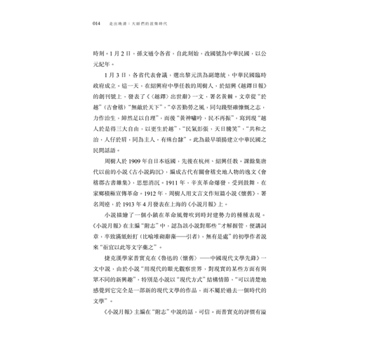 1 月3 日,各省代表會議,選出黎元洪為副總統,中華民國臨時政府成立。這一天,在紹興府中學任教的周樹人,於紹興《越鐸日報》的創刊號上,發表了《〈越鐸〉出世辭》一文,署名黃棘。文章從“於越”(古會稽)“無敵於天下”,“卓苦勤勞之風,同勾踐堅確慷慨之志,力作治生,綽然足以自理”,而後“黃神嘯吟,民不再振”,寫到現“越人於是得三大自由,以更生於越”,“民氣彭張,天日騰笑”,“共和之治,人仔於肩,同為主人,有殊台隸”。此為最早頌揚建立中華民國之民間話語。