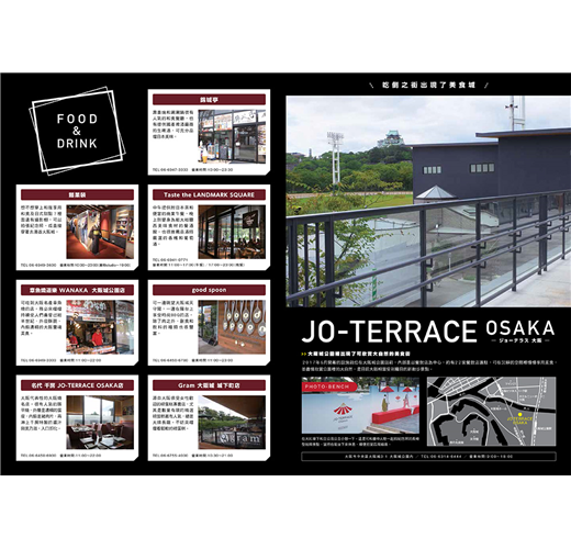 2017年開幕的美食城「JO-TERRACE OSAKA」,為美食的大阪增添了新味道,不僅能在沉靜的空間享用美味餐點,還可盡情欣賞大阪城公園的自然美景。還有以立食餐飲店為主打的裏難波,近年來成為上班族及背包客的新興聚集地。