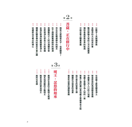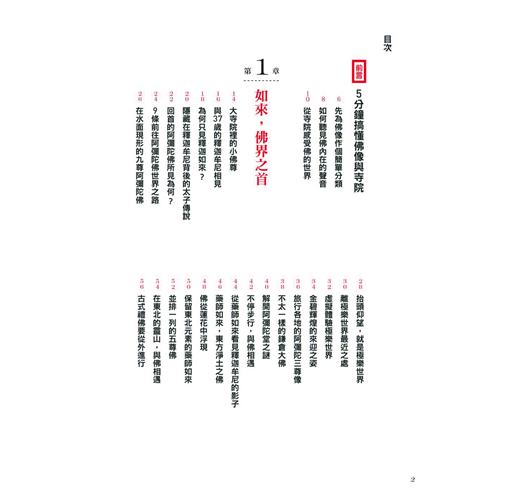 本書將佛像以「如來」、「菩薩」、「明王」、「天部」等階層分類,不僅講述祂們在佛教體系內的職掌,也搭配介紹安奉各式代表性佛像的日本寺院以及特定專題,從佛、佛像藝術、寺院建築中的佛法思想等領域多方切入,引領讀者同步了解佛教文化及藝術之美。