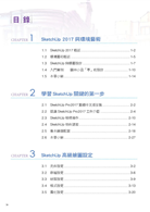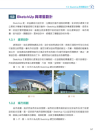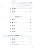 CHAPTER 4 SketchUp輔助設計工具:介紹SketchUp的輔助設計功能,其主要作用是對模型進行不同的編輯操作,並以實例進行結合,內容豐富且非常重要。SketchUp輔助設計工具包括主要工具、建築施工工具、測量工具、鏡頭工具、漫遊工具、剖面工具、檢視工具、樣式工具和構造工具等。