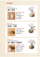 長蔥/紅蘿蔔和紫蘇葉/洋蔥起司/馬鈴薯和巴西里/納豆和滑菇/雞胸肉和薑/大蒜和雞蛋/泡菜/蕪菁和蝦仁/鰤魚/雞肉和香菜