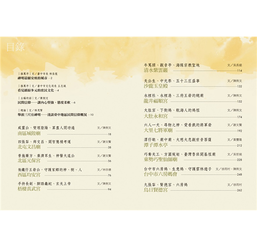 在保存宮廟信仰與弘揚多元文化的氛圍中,今年我們出版了《眾神護臺中》,本書介紹14間宮廟,分別報導:南區城隍廟、北屯文昌廟、北區元保宮、西區均安宮、梧棲真武宮、清水紫雲巖、沙鹿玉皇殿、龍井福順宮、大肚永和宮、大里七將軍廟、潭子潭水亭、東勢巧聖仙師廟、台中市六房媽會、烏日賢德宮。這些宮廟各具特色,也都是重要信仰中心,14座宮廟選擇也兼具臺中山、海、屯、城區的地域平衡,值得細細品味。