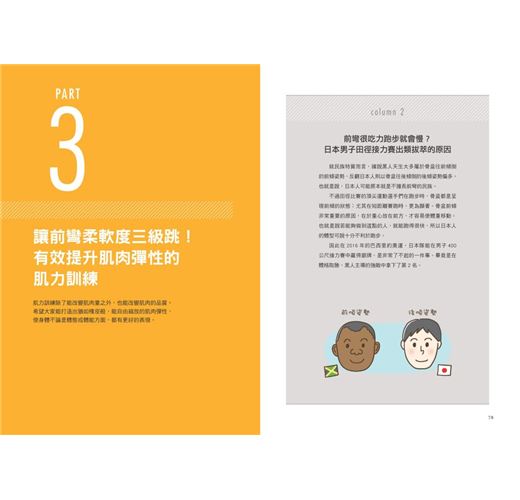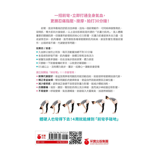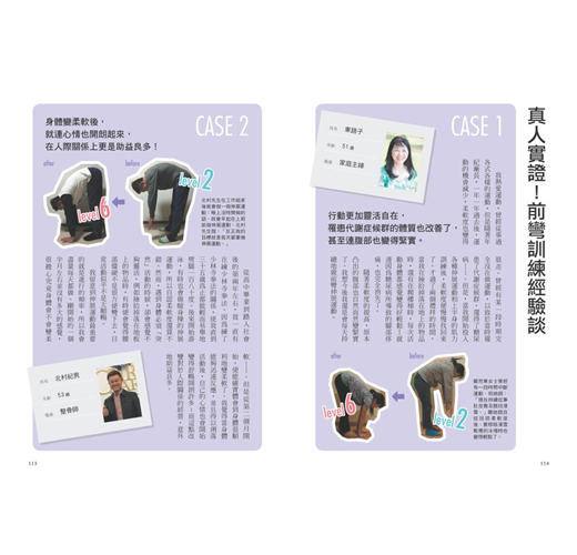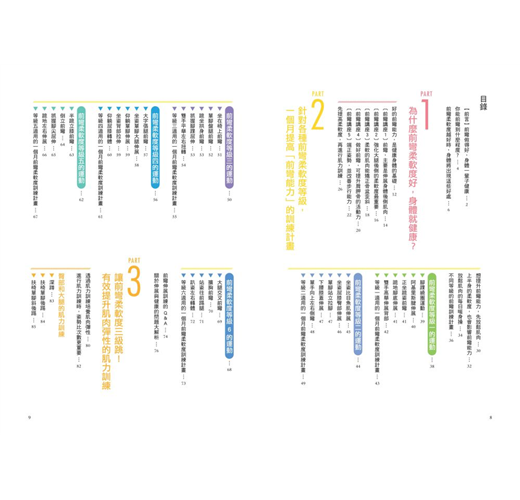 ● 特別收錄:6個難易等級的「瞬間提升前彎柔軟度的1個月訓練計畫」,照表操課,立即見效。