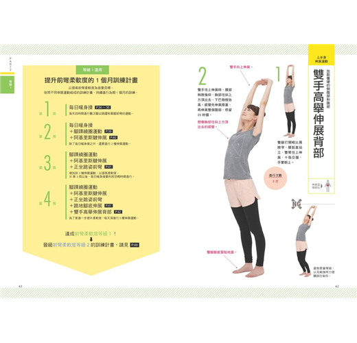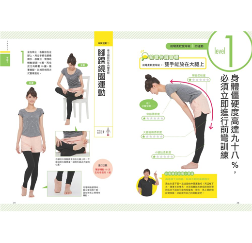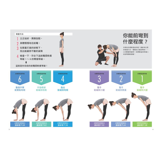 ● 分級練習:針對不同柔軟度的人,分成6個等級,讀者可依自身能力,逐步練習。