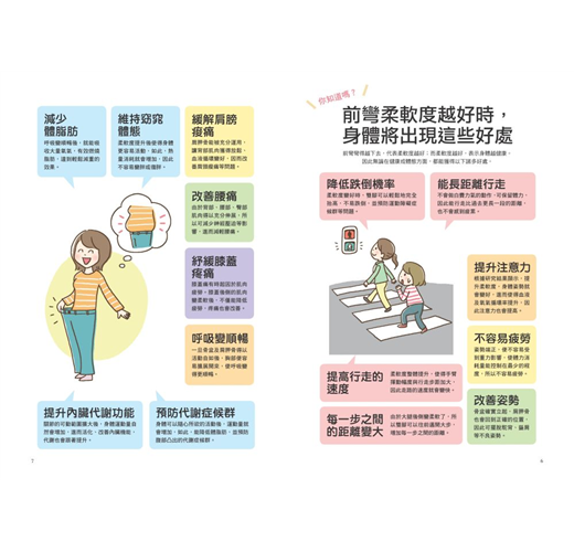話雖如此也切勿心急,請依照書中的6個等級,循序漸進的按表操課,不論是柔軟度如何的人,1個月後身心一定會出現顯而易見的驚人變化。總之,只要每天能多彎下去一點,對身體都是有幫助的。