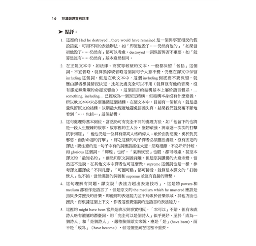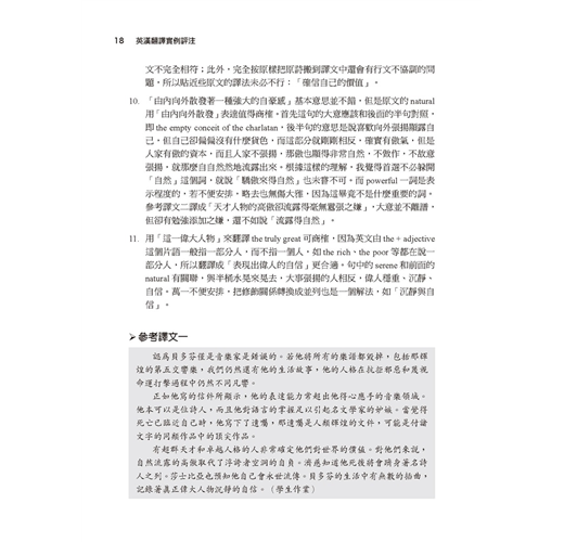 葉子南教授以多年教學與實際翻譯經驗,將英譯漢的技巧、理論、策略,藉由55篇短文詳盡介紹給讀者。本書最大特點是將這55個短文單元以「文本質地」區分為四類:軟文本、偏軟文本、偏硬文本、硬文本,因文本的性質不同,採取的翻譯策略與行文語氣自然也不同。每單元均包括:原文、譯文、點評、參考譯文,簡述文本定位和翻譯策略,清楚呈現最初譯文需要再細修之處,點評則詳加解說該如何理解原文困難之處,又如何在譯文中轉化。此外,每單元末的短文則針對原文提出翻譯時的技巧、理論與建議,提醒、補充重點,書末附上十篇短文作為練習,是極為全面且實用的英漢翻譯參考書。