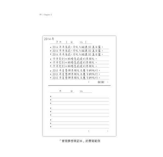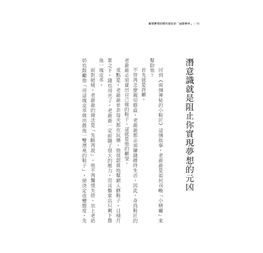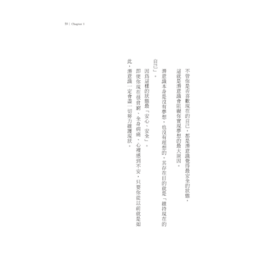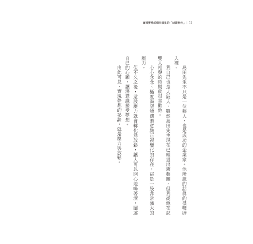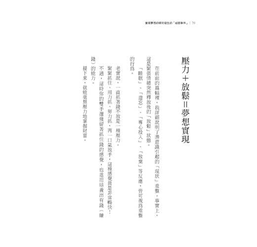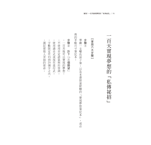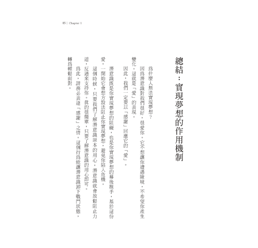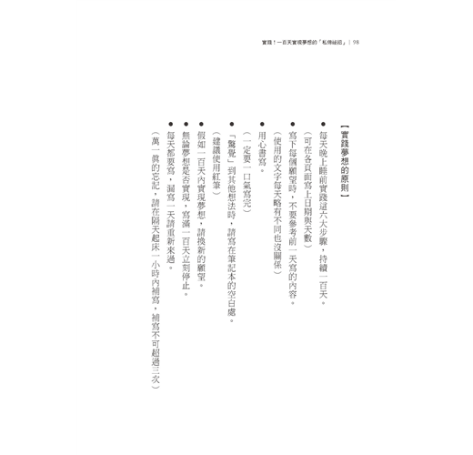 將夢想化為文字,能不斷地催眠並說服喜歡舒適圈的潛意識,進而消除它所產生的二萬倍阻力。只要做一百天就能從壓力中釋放出來,直到放鬆那一刻,即可展現驚人的爆發力。這就是「覺悟」,夢想就是這樣實現的。