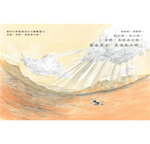 小樹苗歷經萬年,長成參天巨樹,滋養萬物,最後卻被人類破壞而崩毀的畫面,令人怵目驚心。而結尾新生的小樹苗,將帶給小螞蟻希望或再次哭泣呢?本書透過大樹的生命歷程,展現人與自然互動的縮影,值得你帶孩子閱讀與反思。