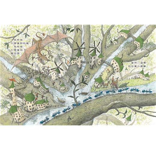 以奇幻小說《陰陽師》聞名國際的日本知名作家夢枕獏,用小螞蟻的視角出發,如縮時攝影般呈現小樹苗長成參天巨木千萬年的歷程,獨特的世界觀和奇幻的想像手法,巧妙的映射出大自然與人類的真實情境;精簡的文字,讀起來極富韻律感,非常適合大聲朗讀。作品曾入圍奧斯卡獎最佳動畫短片的山村浩二導演,以傑出的插畫技巧刻劃充滿生命力和躍動感的萬物,在他筆下的大樹世界,如電影般氣勢磅礡,極具戲劇張力和震撼力,畫面壯闊卻又不失細膩。