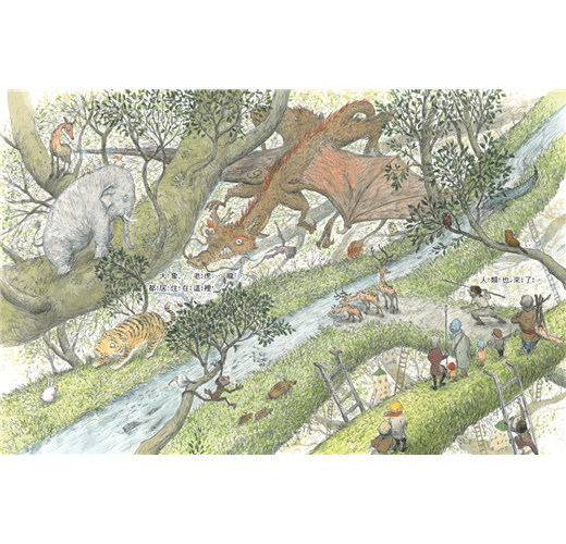 小螞蟻發現一棵好小好小的小樹苗,小樹苗慢慢長高、長大,冒出新芽、伸出枝椏,向天空盡情伸展一千年,向大地站穩腳步一萬年,終於長成一棵巨大無比的樹。大樹上有河流、湖泊,住著大象、老虎、鹿等各種動物,甚至還有龍。然後人類出現,蓋起了城鎮,開通了道路,為了蓋更多房子,砍掉樹枝,甚至為了占據更多樹枝,竟然發動戰爭,成千上萬的城鎮變成一片廢墟,所有的動物和人類都逃離了,最後連大樹也倒塌了……