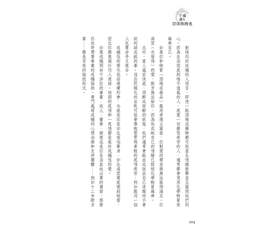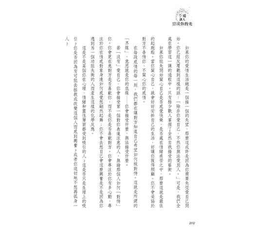 這次,她把焦點放在多年來對於身體工作及心理諮商的體會與認識,從自身的經驗開始發展出來的《不要讓人黯淡你的光》,有幸比讀者更早讀到這本書,其實是一個很激勵自己的過程。因為在閱讀這本書的同時,我也不斷地檢視自己目前的狀態。