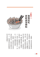 本書援引許多案例,不論是愛斯基摩人吃生肉不吃菜的健康奇蹟,或是美國動物園採取生鮮蔬果餵食法的健康長壽實證,都指向一個答案,生食力量大。要怎麼改變讓人生病的飲食模式,作者貼心提供幾個酵素飲食的原則,餐餐都從酵素開始吃,蔬果先吃、再吃米飯,最後才吃魚肉;早餐不吃也ok,要吃就吃蔬果;八分飽還太多,六分飽剛剛好;碳水化化合物、脂肪、蛋白質不能多吃;身體不舒服,最好不要吃,讓體內酵素充沛飽滿,不做無謂的浪費。