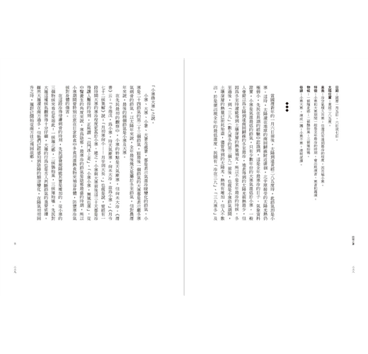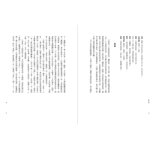 本書對節氣時間的書寫立體而生動。除了從天文、農作,物候、養生,歷史、習俗、文學、詩歌等不同角度切入外,更大膽從《易經》的宏觀視野,探討先民在剝而復始、往復循環的大時間觀念下,所發展出來順天應時的人生智慧、人格體悟以及生活實踐。