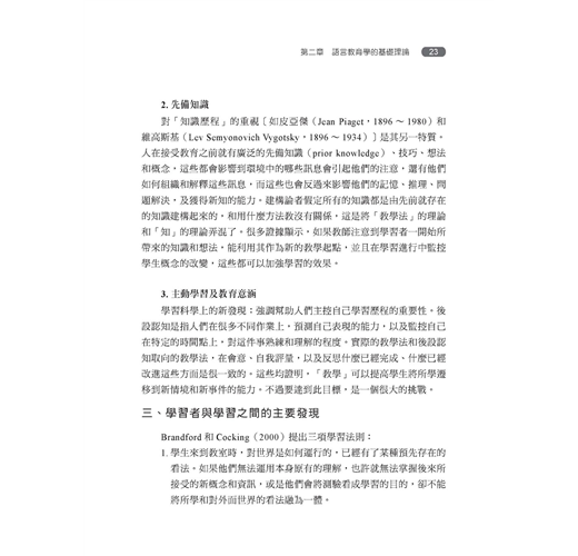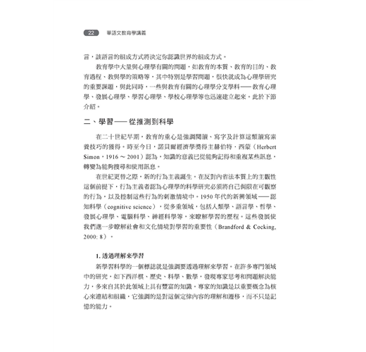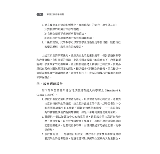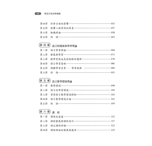 本書即據上所述,斟酌教育應探討的六項基本課題,側重學習者之學習需求,來思考每一章的編寫。本書歸納知識框架,概括性地介紹相關研究成果,讀者可以通過參考文獻,進一步瞭解相關理論及其具體內容。本書對教學過程、教學設計與語言教師發展的探索,主要以問題為開展設計章節,目的是引導職前教師或初學者,儘快瞭解本學科,對於各類相關問題,有個初步認識。配合各章節提出「反思與討論」,結合對外華語教學能力認證考試,對問題的討論力求深入淺出,儘量給學習者留出進一步探索的空間。末章探討語文教師專業發展,每位教師的教學信念,惟有透過教師長期與人互動,並經過省思的過程,方能建構自身的教學信念。