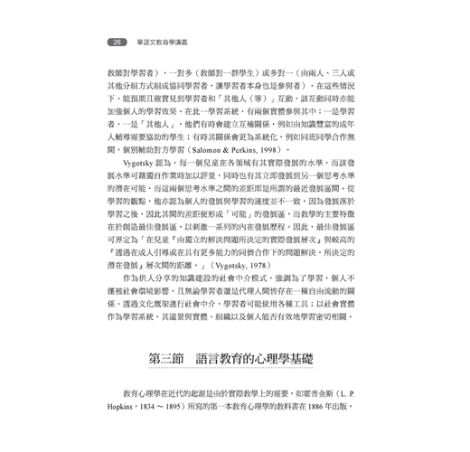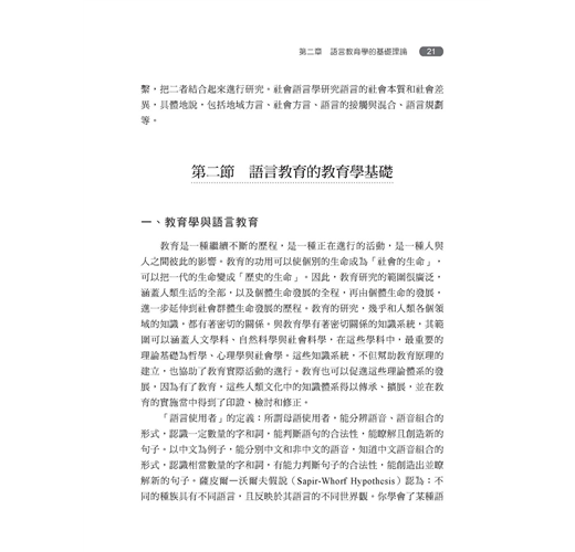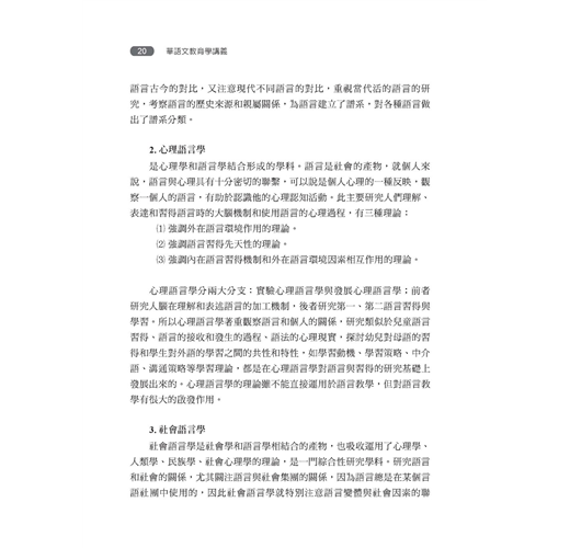 本書主要是為修習華語文教育學課程的學生編寫的教材,帶領職前教師及初學者一覽語言教育概況,也可供正從事或有興趣從事華語教學者參考。語言教育學這門課,筆者在本書撰寫之前已教授過幾年,語言教育學以諸如語言學、教育學、心理學、社會學等相關學科的理論作為自己的理論基礎;不僅受語言學的影響,更多地受制於教育科學,諸如心理學、教育學,以及學習理論、教學理論、測試理論等。從「華語文教育」的名稱來看,不同於單純的「教材教法」學科,名稱不同也意味著華語文教育學從更宏觀的角度研究華語文教學,不僅研究教什麼、如何教的問...