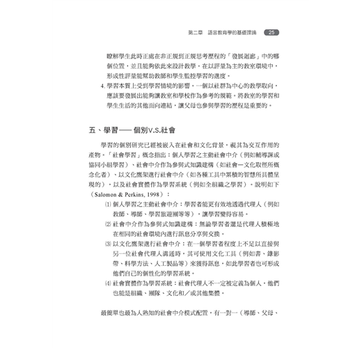 第五章語言教學環境理論探討何處教的問題。自然學習主要由教師採用語言的和非語言的多種手段、技巧去幫助學生理解;課堂學習則主要依靠教師的理解、例證、示範、分析、新舊聯繫等活動,幫助學生理解、記憶語言知識。兩相比較,在呈現階段、遷移階段,我們應該多採用自然學習的技巧,而在實踐階段則多採用課堂學習的技巧。第六章課程則探討教什麼的問題;課程是教師為達到教育目的,所計畫並指導學生的所有學習經驗。