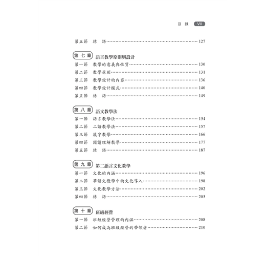 如何教方面探討所佔篇幅較多。第七章探討語言教學原則與設計,在對外華語教學的實踐活動中,我們既要充分考慮到有效教學的普遍目標,也需遵循這些語言教學原則,將兩者有機結合起來。第八章語文教學法,眾多識字教學法,莫不為降低學生學習記憶負荷量,以及引起學生學習動機與興趣為主,不同教學法間亦可並用,端視教學情境及學生需求而安排。第九章第二語言文化教學,說明語言教學必須與文化教學同時進行,只有將語言教學置於文化教學的大背景下,才能更好地培養學生跨文化交際意識,及提高學生跨文化交際能力。教室的管理是今日每一位教師在教學過程中所必須面對的一項重要課題,尤其於海外教學,生手教師最常遇到的問題即是教室管理,第十章班級經營即討論在日常教學中,教師們經常談論的教室管理主題。第十一章語文評量理論與方法則探討學了什麼?評量是幫教師教學的工具,教師職責不僅只是教授課程、編寫試題、實施考試、評分,更重要的是對測驗的分數進行解釋與價值判斷。