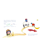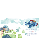 可愛的大臉、童趣的畫風、溫和的筆觸,就如孩童般簡單而清澈明快的想像,令畫面生動又不失細膩。在用色方面,相較於用色溫和的奕瑟,艾勒邦用色較為鮮明,凸顯了艾勒邦的活力,駕駛著紅色的船隻追逐著天空上的藍色的飛機,令人目光為之一亮。細細欣賞,還會發現奕瑟的飛機造型竟然是一隻魚!在天空中飛行的魚,多麼充滿趣味與想像的安排。
