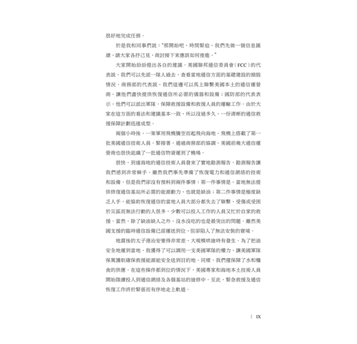 老實說,在第一次召集各部門就通信問題進行會議的時候,我心裡是沒有底的。雖然在成為白宮學者之前,我在英特爾總部工作了7年,對通信行業有著一定的專業認知,但說到救援和重建,我幾乎一無所知。這次救援工作對我來說,絕對是一項全新的挑戰,也是一項艱巨的任務。