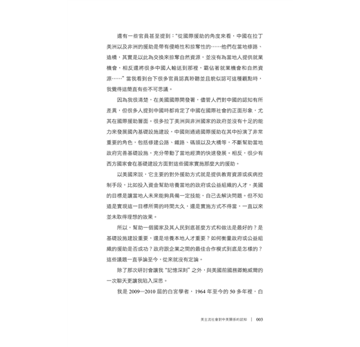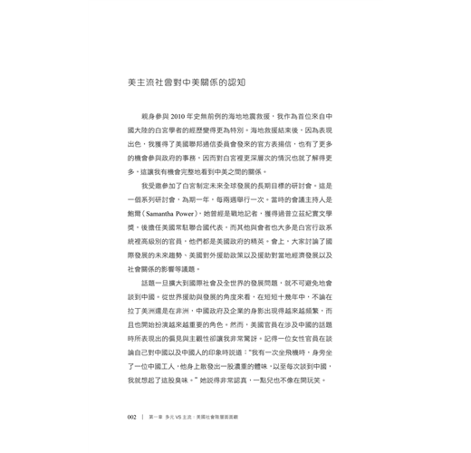 經歷以上種種,我其實一直在尋找一個定義— 我是美國人還是中國人?這讓我覺察到之前所述的4 個角度能貫穿每一個與中美有關的話題。例如,美國到底是維持國際秩序的世界警察,還是像中國人所說的,是一個在抑制中國和平崛起的霸權國家?到底熱愛和平的中華民族只是想恢復自己在世界上的歷史地位,還是會打破亞洲平靜而讓很多美國人加以提防?