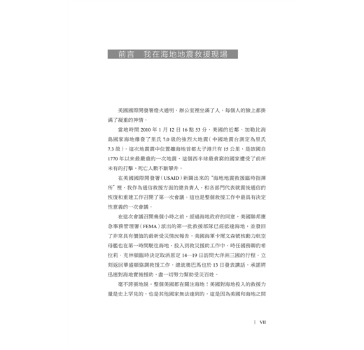 毫不誇張地說,整個美國都在關注海地!美國對海地投入的救援力量是史上罕見的,也是其他國家無法達到的。這是因為美國和海地之間有著一段特殊的歷史淵源。從地理上看,海地與美國隔海相望,海地在中美洲佔據著極為重要的戰略位置。從歷史上看, 1915 年前的海地政變頻繁,美國曾在1915—1935 年這20 年期間對海地有過軍事介入。在此之後,美國逐步將政權交還給海地,時至今日,海地在政治、經濟和文化等方面仍然深受美國影響。在這次大地震中,海地政府整個國家行政系統已瀕臨癱瘓,所以海地決定向美國敞開國門,接受全開放式的國際援助,這在世界救援史上也是極其罕見的。