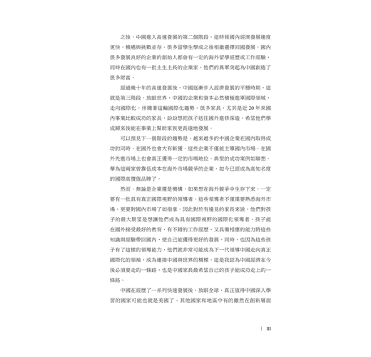 我希望能通過這本書,幫助中產階級以及他們的孩子放眼全球,根據自身特點,結合當今世界多元化的價值體系,通過融合與創新不斷提升自己,成為真正的下一代國際化精英。