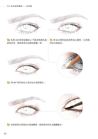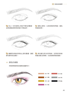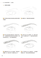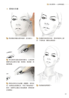 大家可以對著鏡子仔細觀察眼睛,注意眼球與瞳孔的細節。在正常的情感狀態下,眼球並沒有全部露出,有三分之一的眼球是「隱藏」在上眼皮裡的,所以繪製眼睛的時候避免將整個眼球都畫出來;反之在情緒誇張或是睜大眼睛的時候,才會將整個眼球露出。瞳孔呈圓形,與下眼皮會有一小段距離。畫眉毛時要仔細觀察眉毛的走勢,避免畫出雜亂的線條。