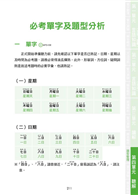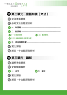 按照考試內容,本書分為四大單元,每一單元一開始分別是「單字整理」、「文法分析」、「閱讀解析」、「題型整理」,接著每一單元都有實力測驗與解答解析,除了一網打盡所有必考重點之外,還能藉由測驗與解析找出應考盲點,厚植實力。