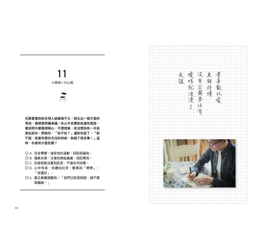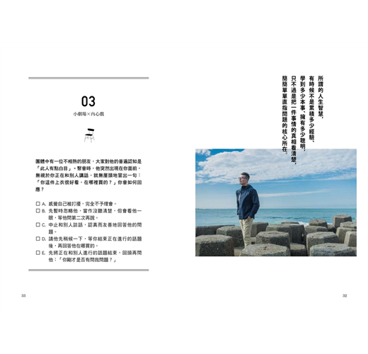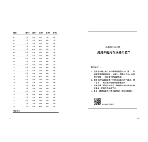 精心設計近50道【小劇場X內心戲】情境心理測驗題,探問你的「幾分熟」指數,書末並有分數解答與自我特質分析。