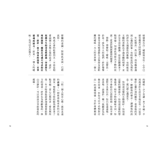 至於如何分辨自己是否足夠成熟?當然不會是功成名就,也不會是滄桑落寞,兩者都容易滲入世故油滑。反而是學會了簡簡單單的處世原則,讓自己無論人前人後都舒服自在,不用講場面話、也不必心虛,既不討好、也不委屈,體貼別人的同時,不會虧待自己。