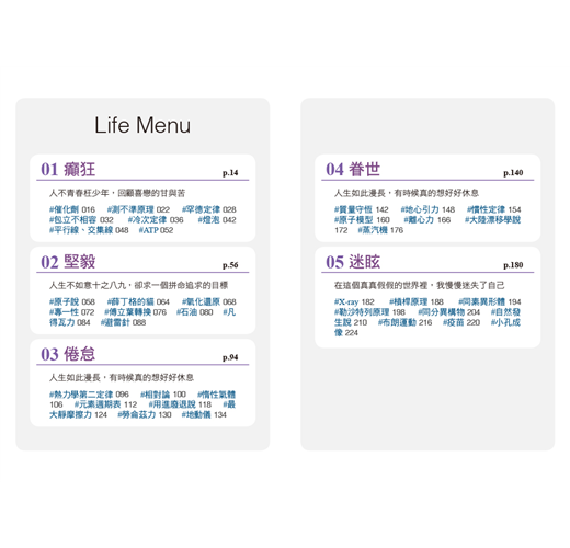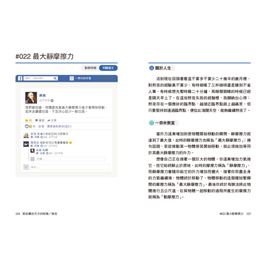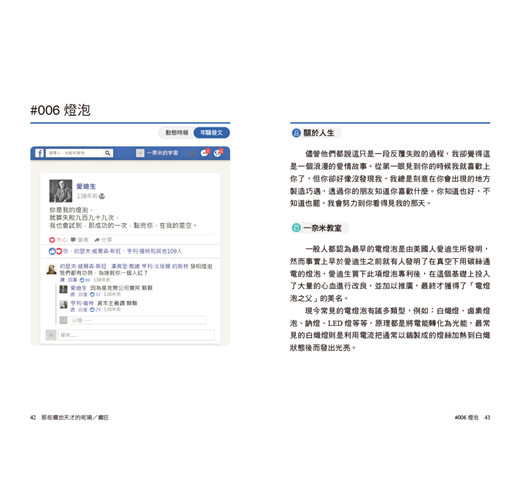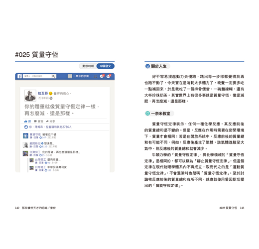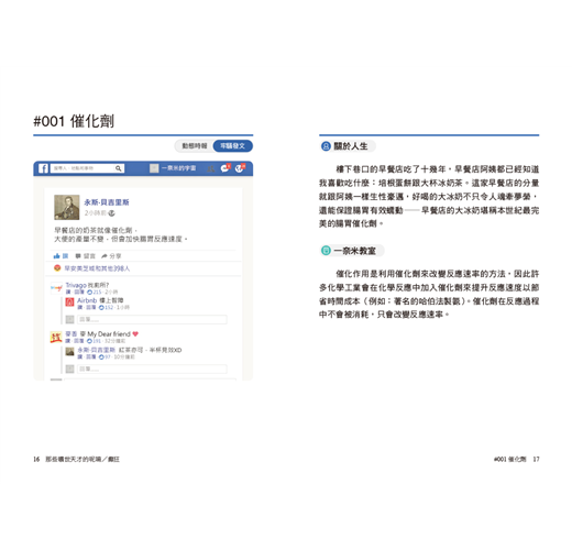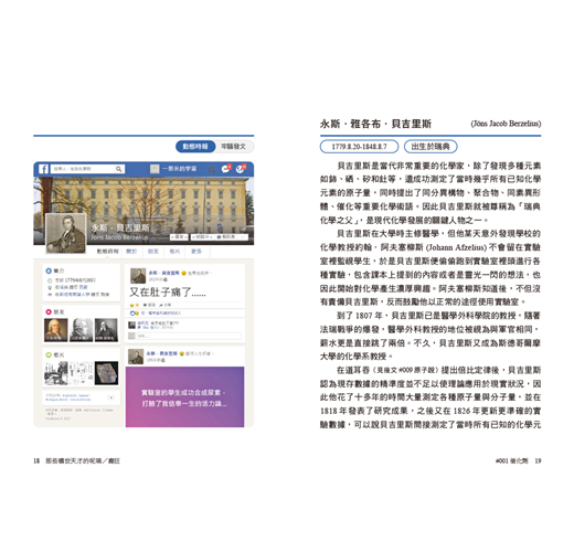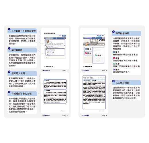 全書各篇皆有「關於人生」、「一奈米的教室」、「牢騷發文」、「動態時報」及科學家小傳,兼具感性、知性與趣味性。其中臉書動態的虛構想像,充滿巧思,絕對讓你嘖嘖讚嘆!