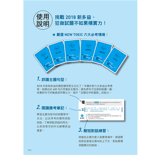 2018年新制多益的題型變得更生活化了!本書針對六大多益必考情境,挑選出580句日常會話主題句。請先將句子從頭到尾讀一遍,培養對句子的敏感度和專注力,提升「從題目中抓重點」的能力。