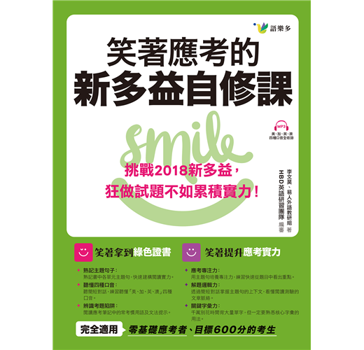 《笑著應考的新多益自修課》就是為你貼心規劃的新多益基礎「打底課程」,共收錄「一般商務」、「銀行業務」、「日常生活」、「休閒娛樂」、「購物消費」、「人際往來」六大職場及生活常考情境。不論你的學習目標,是為了學好英文,還是取得多益證書,這本書都是很實用的選擇。