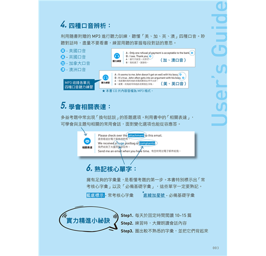 利用隨書附贈的MP3進行聽力訓練,聽懂「美、加、英、澳」四種口音。聆聽對話時,盡量不要看書,練習用聽的掌握每段對話的意思。