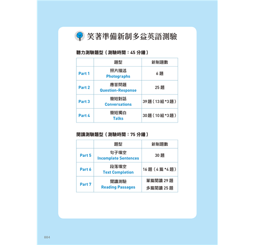 對於即將上路的新版多益,相信各位考生早已摩拳擦掌,全面購買參考書籍、搜尋應考祕訣。根據ETS官方消息,新題型是為了「更貼近日常生活中,社交及職場的英語使用情況。」新制多益的改版重點為,聽力測驗的照片描述題減少,而「簡短對話」題數增加;閱讀測驗則是將雙篇閱讀變更為「多篇閱讀」,雖然文章篇數增加,但是對應的題數卻沒有減少。這兩大重點代表的是:1.考生的答題速度必須加快;2.考生要有一定的英語實力。