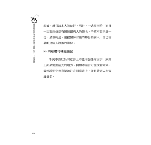 千萬不要以為同意書上不能增加任何文字,原則上如果需要補充的地方,例如本案有可能改變術式,最好說明完後直接加註在同意書上,並且請病人在旁邊簽名。