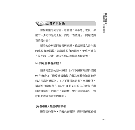 當醫師與病人簽完同意書後,第一件事情絕不是馬上施行該手術或處置,而是需先停下來,再度檢視及確認與病人所簽的這份同意書,到底有沒有問題,以下將分別用「慢得」、「確認」及「證據」三個方向來說明。