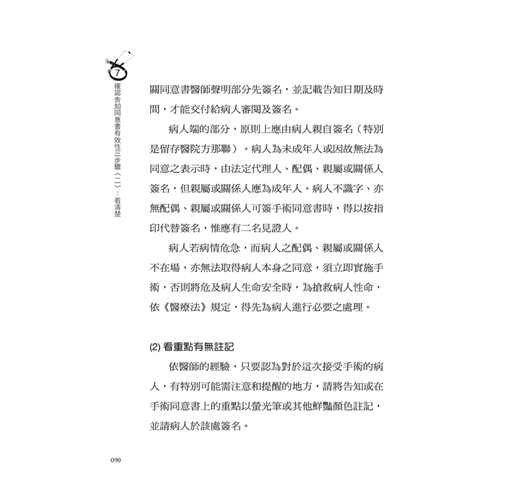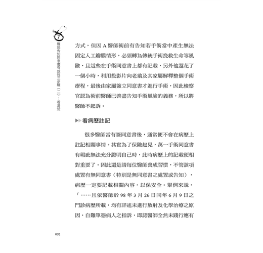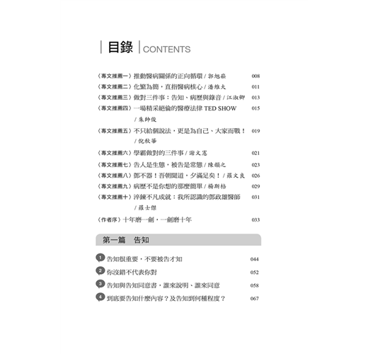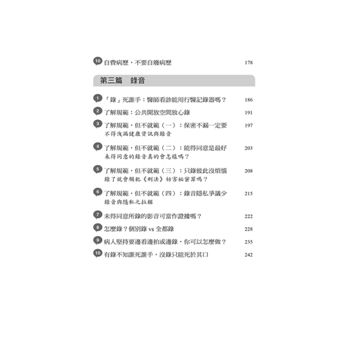 書中分享的方法,絕對不是要醫師「諜對諜」去對抗病患,或是採取「以告止告」的模式,讓自己在訴訟中疲於奔命,而是要以「止戰而不懼戰,備戰而不求戰」的態度,確實做好防範未然的準備動作,因為──