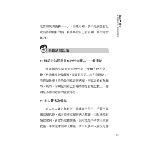 全書分為三大篇:告知、病歷、錄音,共30章。每章體例統一,第一段落是醫療糾紛「案例」的敘述,均為真實發生的事件;第二段落是「分析與討論」,說明案例的爭點與問題所在,以及醫療法律的相關規定、法官判決的理由等;第三段落「老鄧給個說法」則是鄧醫師提出的具體建議,遇到相關情況時,醫師該如何準備與應對,掌握有效方法,預防類似糾紛的發生。