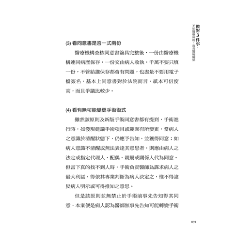 那麼主動防護到底要做對哪三件事,才能不怕醫療糾紛呢?本書會依「告知」、「病歷」、「錄音」這三件事的順序來說明。首先是「告知」,告知是醫師的義務,決定是病人的權利,只有透過主動及確實履行完整醫療及法律上的告知程序,也就是透過文中所提到「停不急,看清楚、說明白」三步驟,才能做到不怕醫療糾紛的第一步「告知」。因為只要是醫療糾紛或訴訟,病人法律上第一個主張的事項,一定是醫師沒告知或者告知不清楚,但真的是醫師沒告知嗎?實際上常常是醫師其實有告知,但在面對被要求證明自己時,往往提不出有效的證據,來證明自己確實有告知或者有按照醫療處置或規定來進行,此時就必須靠「病歷」來幫忙了。