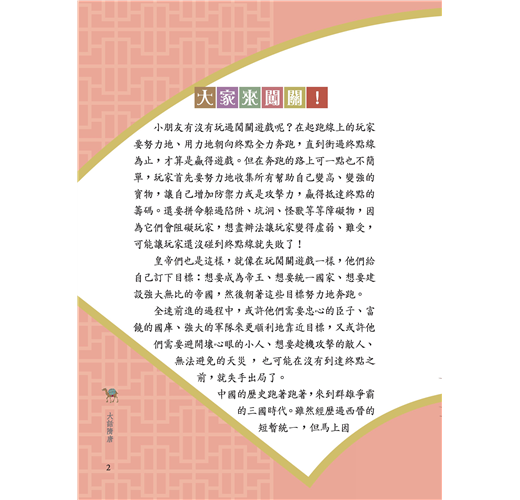 「哇!這真是太豐富了!」雖然我們利用遊戲的概念包裝歷史,但是真正精彩、吸引人的是歷史本身。許許多多的歷史人物、故事串成歷史,而這條時間的長河,也帶著人們向前行。三民書局為小朋友量身打造這套中國歷史,希望小朋友看完了以後,可以很高興的和朋友分享:「歷史,真是超~級~有~趣~!」