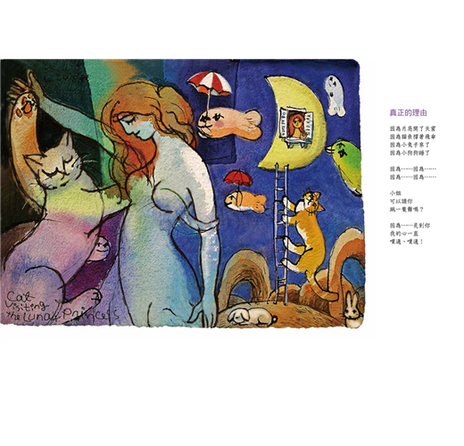 愛貓成痴的知名畫家呂游銘,在台灣長期以兒童圖畫書的創作為人所熟知。但除了兒童繪本,讓他在國際間更享有盛名的,是他的貓畫。呂游銘說:「我和貓相處、互動將近半世紀,如果不讓貓進入我的創作世界,那是難以想像的事。」他創作了非常多以貓為主角的畫作,繪畫風格充滿奇幻感。他很喜歡很近的看貓,從中看見了貓瞬息萬變的感情,在他眾多貓畫中,貓與女人是一個經常出現、不可忽視的主題。呂游銘認為,從貓的身上,他重新找到了我們「文明人類」在成長過程中逐漸消失殆盡、純真可貴的赤子之心。而貓與女人的畫作,表現的正是這樣單純卻又深刻的情感。超現實又充滿想像,色彩斑斕、風格奔放的畫風,深受歐、美、日等收藏家的喜愛。