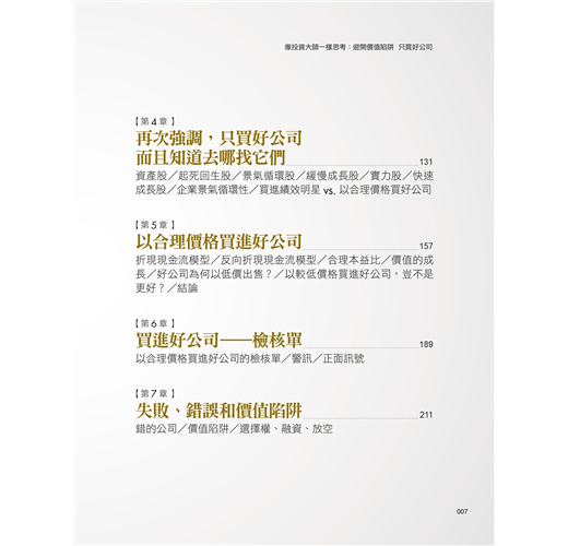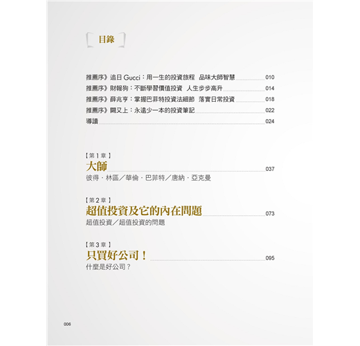 如果你已經看過很多本巴菲特投資法的書,這一本書仍值得你收藏,他強調細節,告訴你評價計算的參數及提供你檢核表,讓你挑出好公司。