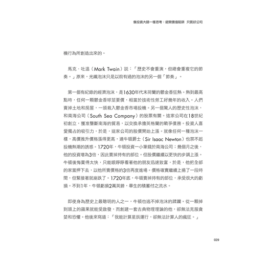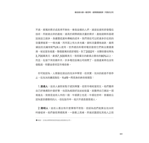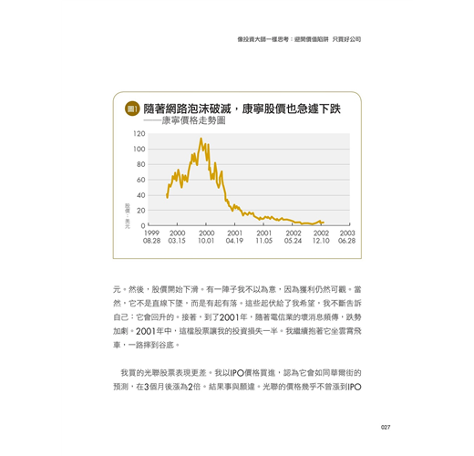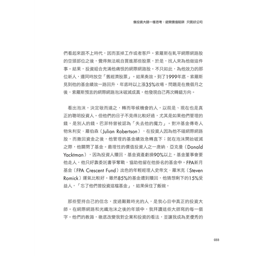 那些堅持自己的信念,度過艱難時光的人,是我心目中真正的投資大師。在網際網路和光纖泡沫之後的年頭中,我拜讀這些大師寫的每一個字。他們的教誨,徹底改變我對企業和投資的看法,並讓我成為更優秀的投資人。