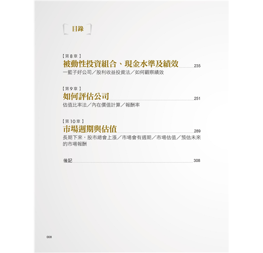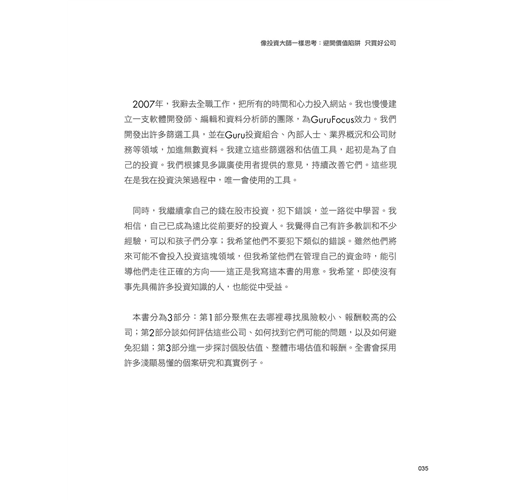 本書分為3部分。第1部分聚焦在去哪裡尋找風險較小、報酬較高的公司。第2部分談如何評估這些公司、如何找到它們可能的問題,以及如何避免犯錯。第3部分進一步探討個股估值、整體市場估值和報酬。全書會採用許多淺顯易懂的個案研究和真實例子。