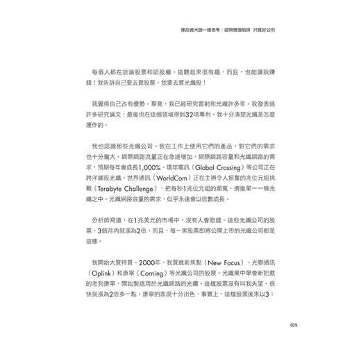 我開始大買特買。2000年,我買進新焦點(New Focus)、光聯通訊(Oplink)和康寧(Corning)等光纖公司的股票。光纖業中學會新把戲的老狗康寧,開始製造用於光纖網路的光纜。這檔股票沒有叫我失望,很快就漲為2倍多一點。康寧的表現十分出色,事實上,這檔股票後來以3:1的方式分割。真是有趣!