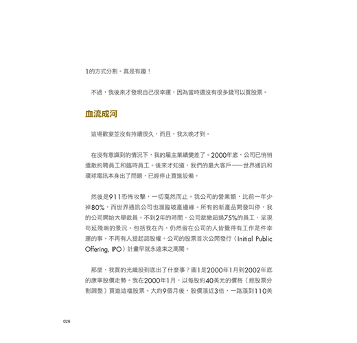 然後,是911恐怖攻擊,一切戛然而止。我公司的營業額,比前一年少掉80%,而世界通訊公司也瀕臨破產邊緣。所有的新產品開發叫停,我的公司開始大舉裁員。不到2年的時間,公司裁撤超過75%的員工,呈現苟延殘喘的景況。包括我在內,仍然留在公司的人,皆覺得有工作是件幸運的事。不再有人提起認股權。公司的股票首次公開發行(Initial Public Offering, IPO)計畫早就永遠束之高閣。