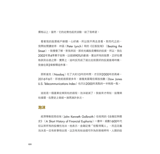 看著我的股票帳戶餘額,心好痛,所以我不再去查看。取而代之的,我開始閱讀彼得.林區(Peter Lynch)寫的《征服股海》(Beating the Street)。我慢慢了解,對我來說,那些光纖股是糟糕的投資,所以,我在2002年第4季棄子投降,以超過90%的虧損,賣出所有的股票,正好在價格跌到谷底之際,實際上,這時反而成了遠比從前要好的投資進場時機,我會在第2章解釋這件事。