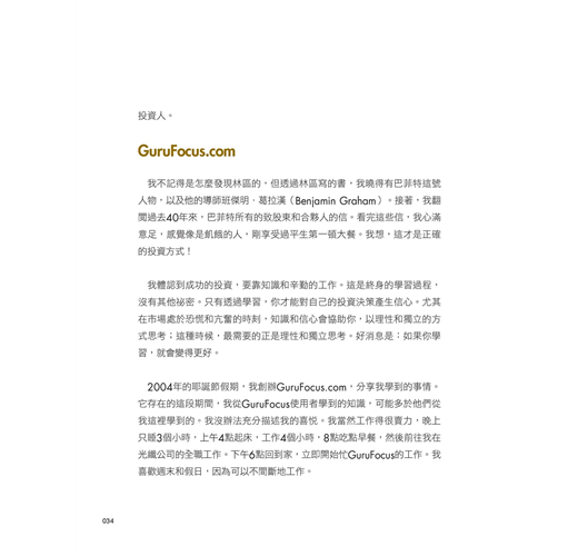 我知道GuruFocus是從Allan那邊推薦的,該網站相當完整,每個月超過50萬投資人,以及世界各地超過100所大學的教授和學生都在使用。當我知道本書作者田測產博士是價值投資網站GuruFocus.com創辦人兼執行長時,我立刻就回信給《Smart智富》月刊編輯願意接受撰寫本書推薦序的邀約。